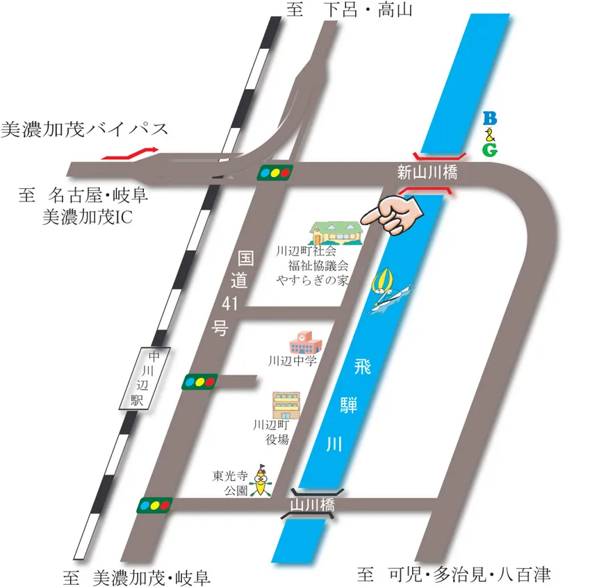 やすらぎの家アクセス 〒509-0303岐阜県加茂郡川辺町石神128番地 やすらぎの家TEL:0574-53-2121 駐車場 P1(第1駐車場) 駐車場 7台大変少ないですので無理な駐車はご遠慮ください。 P2(第2駐車場) 駐車場 57台 やすらぎの家の裏になります。 P3(第3駐車場) 駐車場 31台 職員駐車場ですが、空いている所は、使用可能です。