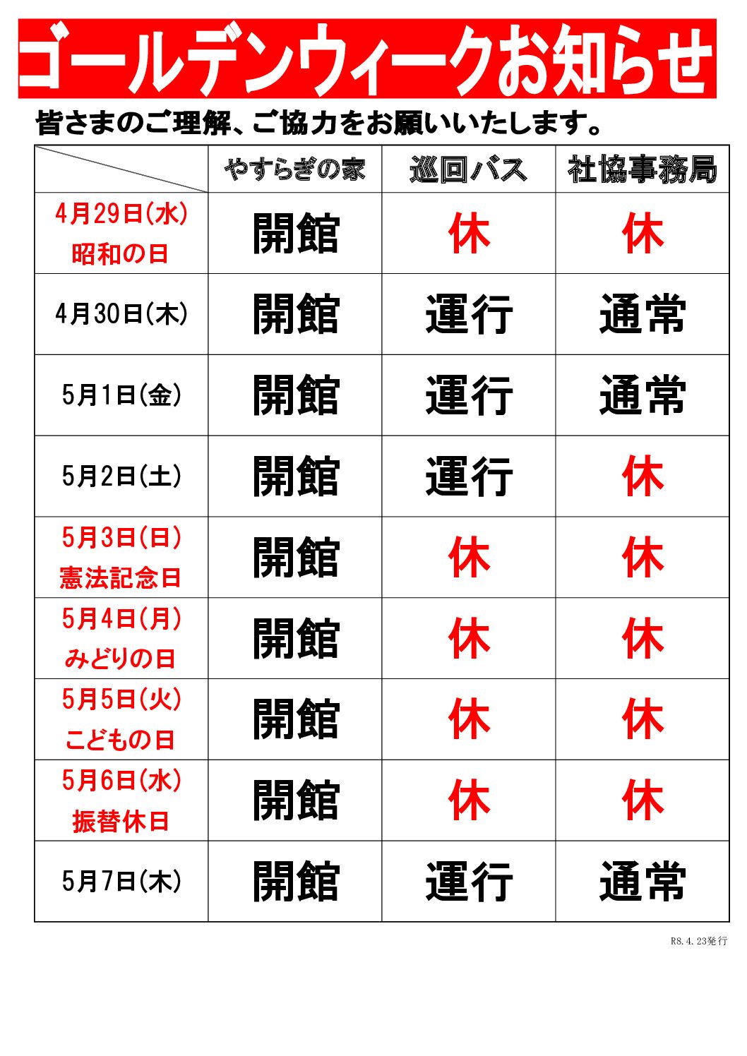 ゴールデンウィークのバス運行・やすらぎの家開館の案内